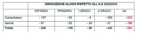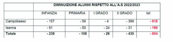 Nell’anno 2023-2024 il Molise perderà 804 alunni (618 in provincia di Campobasso e 186 in provincia di Isernia). La popolazione scolastica scenderà a 34.269 studenti. I dati sono stati forniti dall’Usr ai sindacati in occasione dell’informativa sugli organici.