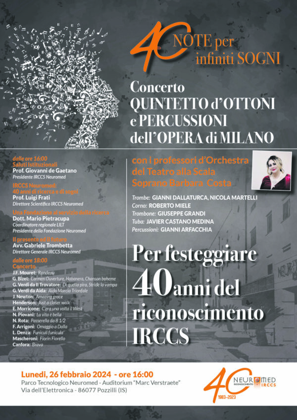 Il quarantennale sarà celebrato con una serie di eventi. Il primo è il concerto del Quintetto di ottoni e percussioni dell’Opera di Milano con i maestri dell’Orchestra del Teatro alla Scala insieme al soprano Barbara Costa. Si terrà domani (lunedì, 26 febbraio), a partire dalle ore 16, presso l’Auditorium “Marc Verstraete” del Parco tecnologico di Pozzilli, in via dell’Elettronica.