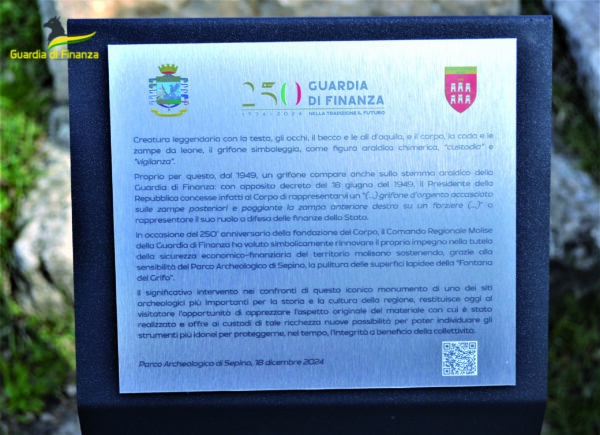 Le celebrazioni per il 250° anniversario della fondazione della Guardia di Finanza – organizzate nel corso dell’anno dal Comando regionale Molise – si sono concluse ieri a Sepino, nello scenario suggestivo del Parco archeologico e alla presenza delle massime autorità istituzionali, con la presentazione della pulitura delle superfici lapidee della “Fontana del Grifo”, significativo monumento di età augustea che è posto in prossimità dell’Area Forense del sito.