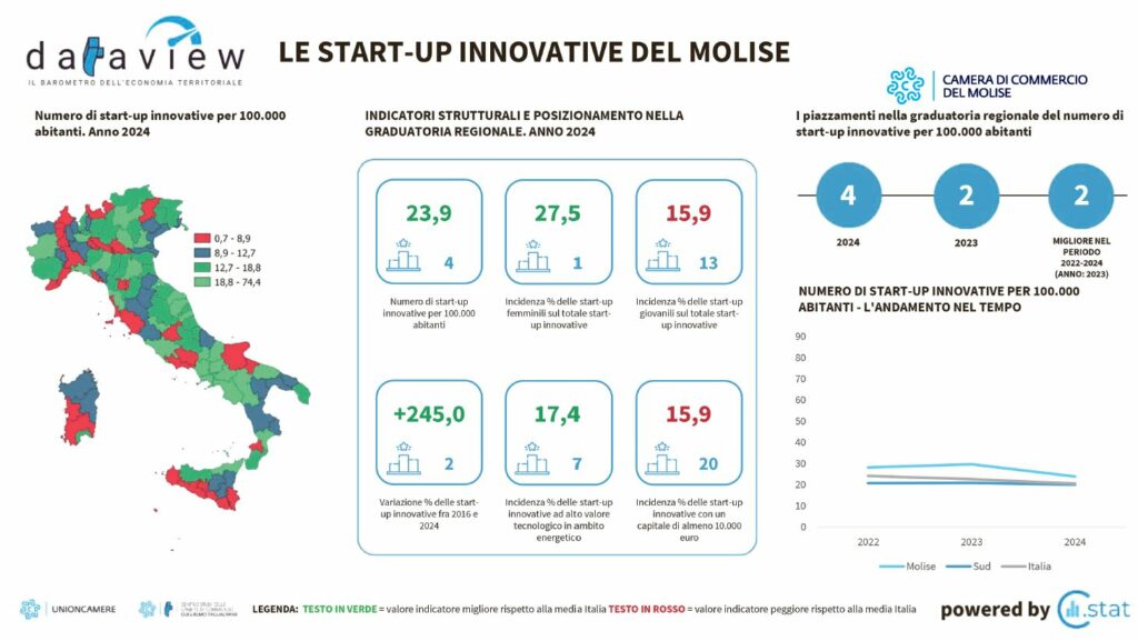Le infografiche pubblicate dal Centro Studi Tagliacarne evidenziano come l’indice del numero di start-up innovative per 100.000 abitanti nella regione è pari a 23,9, posizionando il Molise al quarto posto nella classifica regionale, in lieve calo rispetto al 2023, quando la posizione era la seconda. Il miglior piazzamento tra il 2022 e il 2024 risale proprio al 2023, segno di una fase di sviluppo che necessita di continuità e sostegno per consolidarsi ulteriormente.
