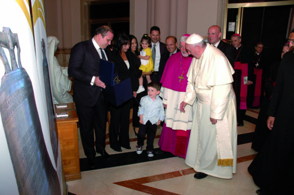 all’ingresso del Santuario dal Santo Padre. Papa Francesco si intrattenne con loro per alcuni minuti, ringraziandoli per il dono della campana – fusa dalla Pontificia Fonderia Marinelli di Agnone – che completava il concerto campanario della Basilica. Un gesto generoso, accompagnato anche dal restauro delle campane esistenti, che fu molto apprezzato dal Pontefice.