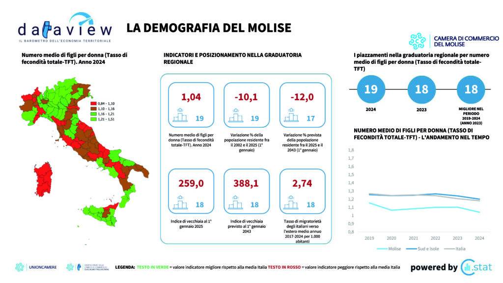 I più recenti dati demografici tracciano per il Molise un quadro particolarmente sfidante, si legge nel report, con diversi indicatori al di sotto della media nazionale. Nel 2024 il numero medio di figli per donna si ferma a 1,04 – dato che colloca la regione al 19° posto tra le 20 italiane – segnalando una persistente difficoltà nella natalità.