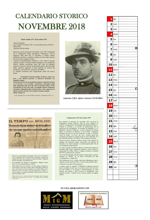 Pagine di storia molisana, racchiuse in un calendario dedicato alle Forze Armate e di Polizia. Una pubblicazione che celebra in maniera trasversale il popolo in uniforme, originario del Molise, o che nel Molise ha operato. Il lavoro porta la firma di Giuseppe De Dona, Lorenzo Orrino, Antonio Lanza e Vincenzo Robusto, in collaborazione con il M.I.G.G., Museo Internazionale delle Guerre Mondiali di Rocchetta al Volturno. Filo conduttore, l’impegno quotidiano dei cittadini in divisa, al servizio della collettività, sia in pace sia in guerra.