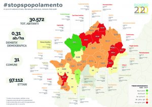 Dallo studio emerge che ad accompagnare lo spopolamento di questi comuni è in primo luogo l’incidenza della popolazione anziana rispetto a quella giovane, l’indice di vecchiaia (che esprime la quota di anziani di età oltre i 65 anni che è presente per ogni 100 residenti di età fino a 14 anni) infatti mostra valori molto alti in tutta l’area, prevalentemente compresi tra il 200% e il 600%.