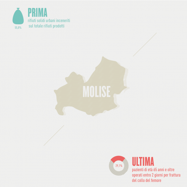 Nella sintesi dell’Osservatorio nazionale sulla salute nelle regioni italiane e della Cattolica (che curano il progetto Osservasalute) altre due percentuali: il Molise è primo per rifiuti solidi urbani inceneriti (55,8% sul totale) e ultimo per pazienti dai 65 anni in su operati entro due giorni per frattura del collo del femore (il 29,1%).