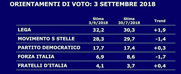 Il partito di Salvini, nella rilevazione che testa il gradimento al 3 settembre, è stimato al 32,2%. Il 30 luglio era al 30,3. Quasi il 2% in più. In mezzo, un mese di fuoco: il crollo del ponte di Genova e il giro di vite sulle concessioni, la nave Diciotti e l’inchietsa su Salvini. In questo mese scende il partner di governo della Lega, il Movimento 5 Stelle: -1,4%, dal 29,7 al 28,3%.