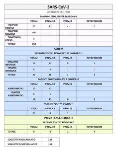 Cinquanta casi in Molise: 41 in provincia di Campobasso, 4 della provincia di Isernia e 5 provenienti da altre regioni. Al Cardarelli sono ricoverate 20 persone (compreso il paziente trasferito dal Neuromed ieri): 13 sono in malattie infettive, tutti della provincia di Campobasso; 6 invece sono in terapia intensiva (3 della provincia di Campobasso , 1 della provincia di Isernia e 2 di Bergamo). Sono, inoltre, 19 le persone isolate al domicilio. Quasi 400 i soggetti in quarantena o sorveglianza.