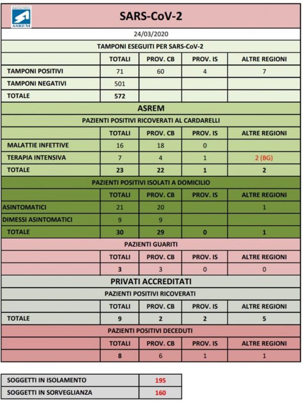 Il bilancio quotidiano dell’Asrem fa il punto anche sul numero di tamponi fin qui eseguiti, 572, e specifica il dettaglio dei ricoverati e non. Al Cardarelli sono in cura 23 persone: 18 in malattie infettive (due sono stati dimessi ieri) e 7 in terapia intensiva. Due dei pazienti in rianimazione, ha detto il dg Asrem Florenzano, mostrano miglioramenti. Sono invece 30 i malati isolati al domicilio e tre i guariti. Sale anche il numero dei decessi: sono 8. È risultato positivo il tampone post mortem effettuato su un anziano di Montenero.