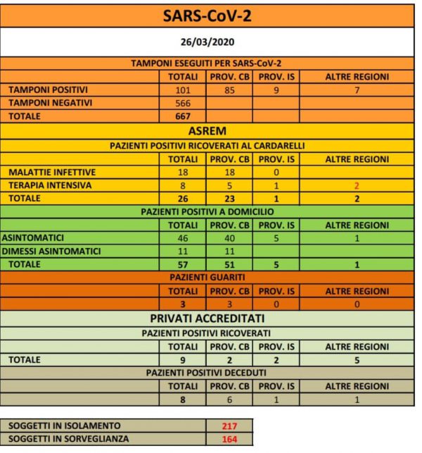 Il 26 marzo forse per il Molise finora è stato il giorno più duro. Il virus che ormai si espande a macchia d’olio, tocca anche il secondo capoluogo di provincia: due giovani isernini rientrati dal Nord (e già in isolamento) portano a 4 i residenti in città colpiti dal covid (altri due sono ricoverati al Neuromed). Primo caso a Petacciato, due invece i casi a Ururi, tre a Montagano, altri 3 a Filignano.