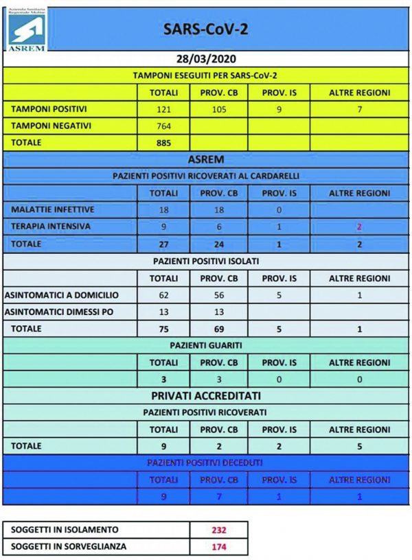 Crescono i pazienti positivi al Covid-19: ieri sera l’ultimo bollettino ha fissato il numero a 121 di cui 105 residenti nella provincia di Campobasso e 9 in quella di Isernia. I tamponi processati sono 885 e di questi 764 hanno dato esito negativo. Ventisette i pazienti ricoverati al Cardarelli: 18 nel reparto di malattie infettive e 9 in terapia intensiva. Duecentotrentadue i soggetti in isolamento e 174 in sorveglianza come si evidenzia dalla tabella riepilogativa e aggiornata. Fortunatamente non si sono registrati altri decessi. E sui nuovi casi di pazienti positivi, il sindaco di Riccia rassicura la popolazione. «Non si tratta infatti di due nuovi casi di contagio ma di un unico caso: una persona originaria di Riccia ma residente da tempo a Campobasso, che si trovava già in quarantena. Al momento le sue condizioni di salute appaiono buone». Nel centro del Fortore, i casi di contagio restano fermi a due quindi. Sul fronte della solidarietà, sempre da Riccia l’azienda dolciaria ‘Colle Molisano’ ha donato un ventilatore polmonare all’Asrem mentre il caseificio al Sabatella nei prossimi giorni consegnerà al Comune altre mascherine da distribuire alla popolazione. Il Covid 19 ha fatto purtroppo il suo ingresso a Ripalimosani. Immediatamente anche il sindaco Marco Giampaolo ha inteso rassicurare la popolazione con un video su Facebook. «Le due persone erano già in quarantena da 15 giorni: chiusi in casa non hanno avuto contatti con nessuno. Hanno superato la fase critica, non hanno febbre e stanno decisamente meglio». Il primo cittadino reitera l’invito a restare a casa, ad uscire il minimo indispensabile e comunica che i dispositivi di protezione individuale sono in distribuzione per chi è costretto ad uscire per motivi di lavoro.