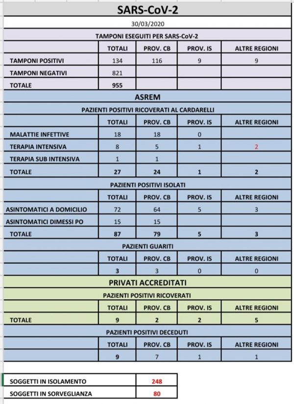 Sono 134 in totale i positivi al coronavirus, 955 i tamponi finora eseguiti.
