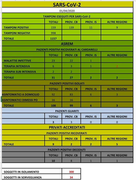 Salgono a 159 (+15 rispetto a martedì) i contagi in Molise, 26 i comuni interessati. Sono 1.157 i tamponi finora effettuati dall’Asrem: 998 quelli negativi. I contagiati sono residenti per la stragrande maggioranza in provincia di Campobasso (139), 11 di quella di Isernia e 9 sono extraregionali. Al Cardarelli sono ricoverati 31 Covid, 2 di loro (in terapia intensiva) sono stati trasferiti qui da Bergamo. Asintomatici in isolamento domiciliare sono 108 (16 di loro sono stati dimessi dall’ospedale). Gli ufficialmente guariti sono 3, dieci invece le persone decedute. E 9 i positivi ricoverati al Neuromed.