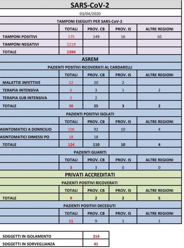 Tre casi in più a Riccia, altri 3 a Venafro. Un contagio ancora a Campobasso e uno a Montenero di Bisaccia. È l’incremento, in dettaglio, rispetto a giovedì 2 aprile.