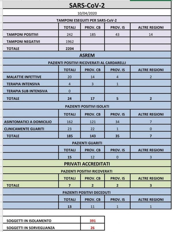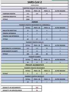 Salgono a 2.204 i tamponi effettuati dall’Asrem, 242 i positivi. Nove in più rispetto a giovedì, Aumentano pure i guariti: 15 in totale le persone sottoposte a due tamponi di controllo a distanza di 24 ore e in entrambi i casi il risultato è stato negativo. Fra questi, da ieri, uno dei due 66enni di Bergamo. Resta in malattie infettive per qualche altro giorno, per un po’ di riabilitazione motoria dopo tre settimane di terapia intensiva. La prossima settimana insieme alla Protezione civile la direzione sanitaria organizzerà il suo ritorno a casa, in Lombardia.