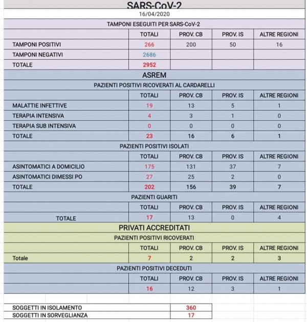 Nessun nuovo ricovero, ancora una volta, in terapia intensiva. Sale il numero dei guariti, negativo al test di controllo anche il paziente 1 di Campochiaro. Sale purtroppo anche il bilancio dei decessi: è morta ieri una delle anziane della casa di riposo di Agnone Tavola Osca che era stata spostata insieme agli altri al Ss Rosario e poi al Cardarelli. Il totale delle morti Covid-19 è adesso di 16.