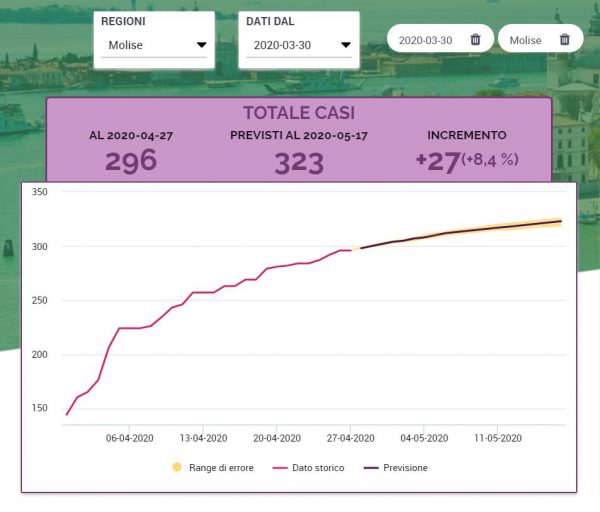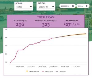 La tecnologia al servizio della sanità consente di monitorare in anticipo un fenomeno organizzando al meglio la risposta del sistema. E non ci sono solo le cattive notizie. Engineering ha calcolato anche l’evoluzione del numero di malati, gli attualmente positivi: dai 200 del 27 aprile in Molise scenderanno a 164 il 17 maggio, 36 in meno (il 22,2%). I guariti, in ultimo, cresceranno del 37%: da 75 (che è la somma dei completamente guariti e dei dimessi dall’ospedale che la Protezione civile nazionale al contrario di Asrem considera nella stessa cifra) a 119 di metà maggio.