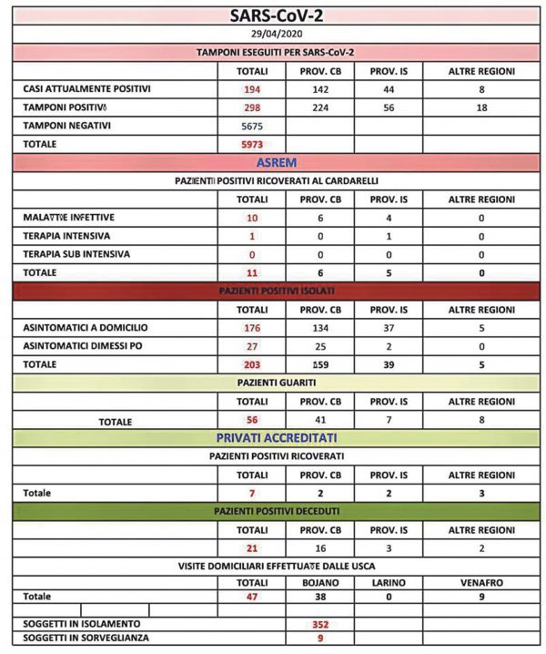 La persona guarita, invece, è di Filignano, dove il focolaio individuato è familiare. È il secondo guarito, dichiarato tale dopo un doppio tampone consecutivo negativo, di quel cluster. E nel complesso il 56esimo guarito del Molise.