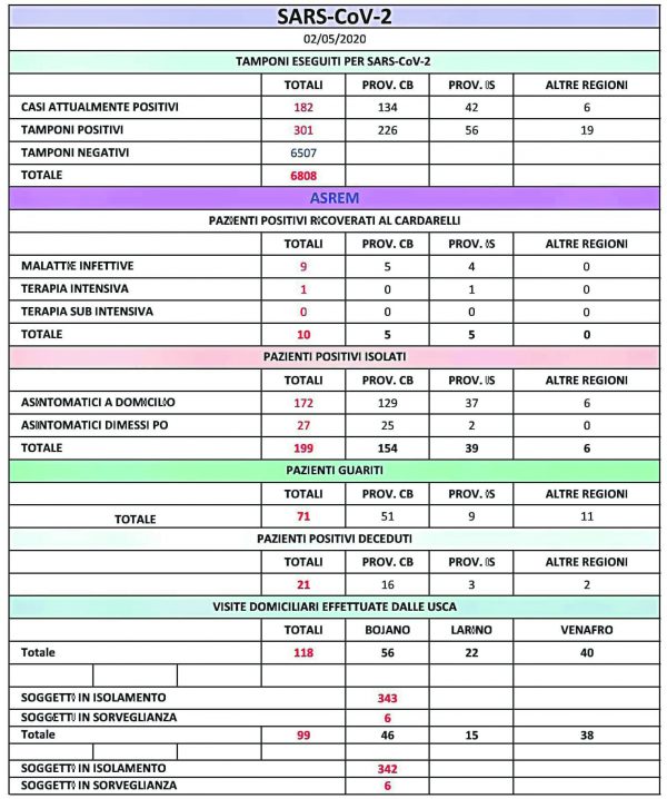 Intanto l’elenco dei guariti viene aggiornato. Ieri altre quattro persone, tutte di Campobasso, sono risultate negative al secondo tampone.