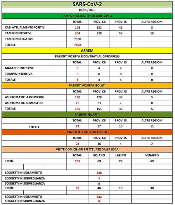 Stabile, invece, il numero dei ricoverati in ospedale: 9 in malattie infettive al Cardarelli. I nuovi malati sono tutti e tre isolati al domicilio: rispettivamente a Campolieto, Termoli e Isernia.