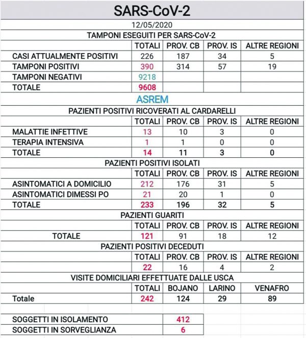 Aumenta sensibilmente anche il numero dei guariti però: 10 in totale ieri. E di questi 7 sono di Cercemaggiore e 3 di Campobasso. Complessivamente i guariti sono 121.