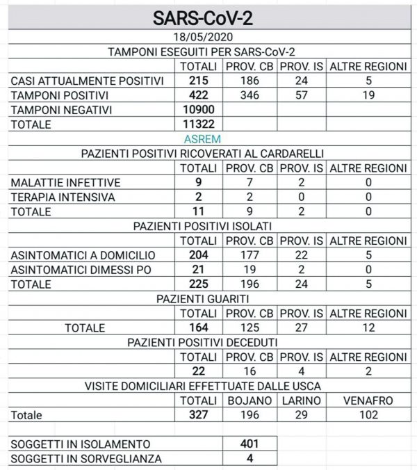 Un solo positivo in più (ma i tamponi processati nelle 24 ore considerate sono 48 e non comprendono quelli eseguiti a Termoli fra i vicini della famiglia rom risultata positiva nelle ultime ore (è il nuovo cluster identificato nella città adriatica). Si tratta di un uomo rientrato a San Martino in Pensilis dove risiede: era già positivo fuori regione dove era stato ricoverato, ha fatto sapere l’Asrem.