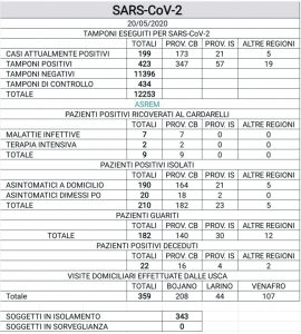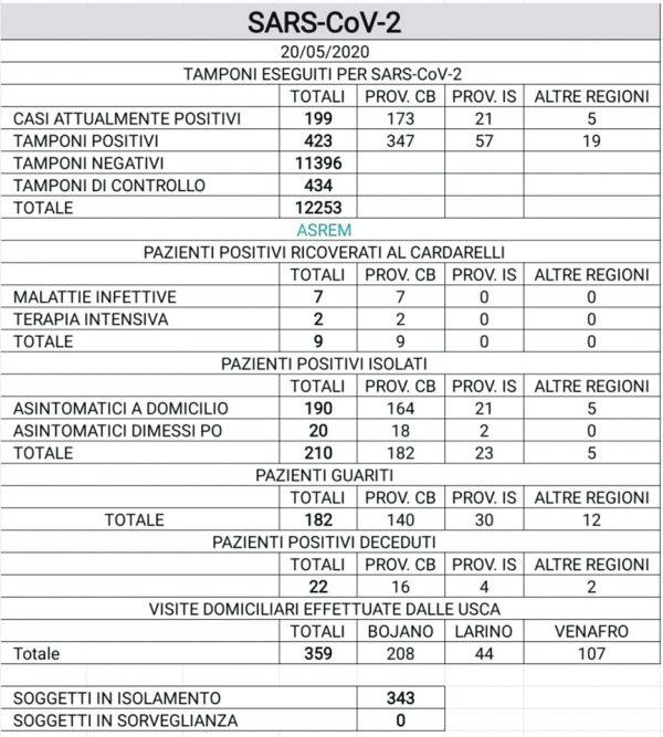 I guariti, dunque, sono di Campobasso (5), Termoli (3), Toro (1), Isernia (1), Carovilli (1) e Poggio Sannita (1).