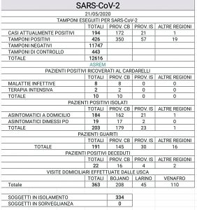 I casi attualmente positivi sono 194, mentre i guariti sono saliti a 191. Nove quelli ufficializzati ieri: 3 di Campobasso, 1 di Termoli, 1 di Ferrazzano, 1 residente a Pietravairano, 1 residente a Casalnuovo di Napoli e due con residenza a San Nicandro Garganico.