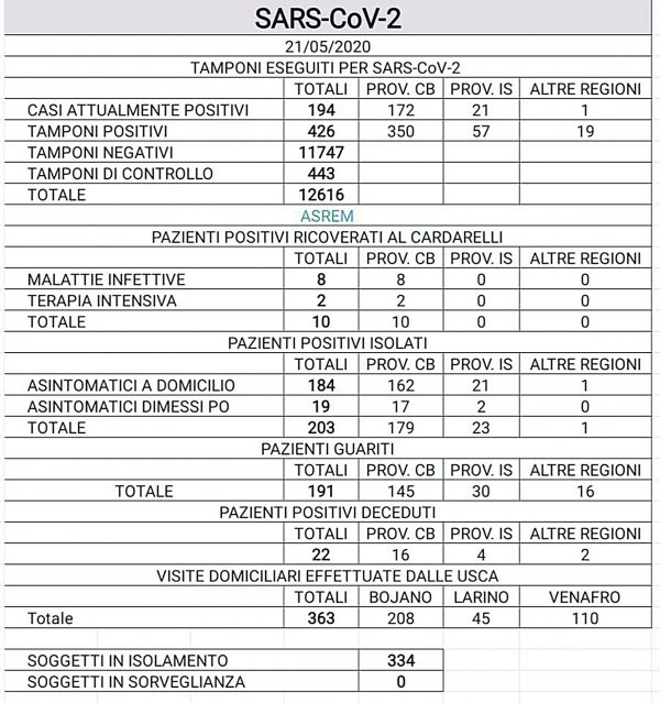 Infine, sono 334 in Molise le persone poste in isolamento.