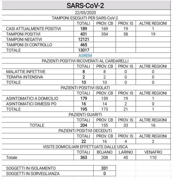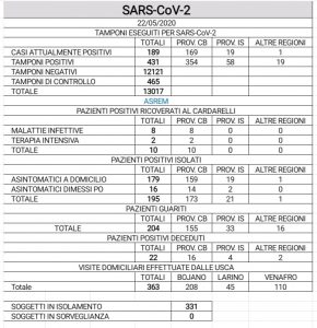 Resta quindi fermo il numero dei ricoveri al Cardarelli: 8 in malattie infettive e 2 in terapia intensiva. In totale i tamponi fin qui eseguiti sono 13.017, 465 quelli di controllo. Gli attualmente positivi sono 189. I pazienti isolati al domicilio, in totale 195. I guariti sono saliti a 204, nella giornata di ieri ne sono stati ufficializzati 13: 5 di Campobasso, 2 di Termoli, 2 di Campolieto, 1 di Agnone, 1 di Carovilli, 1 di Ururi e 1 di Castelpetroso.