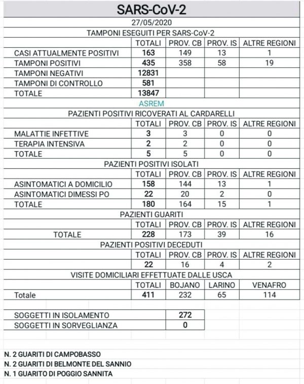 Sale a 228 il numero dei guariti: ieri se ne sono registrati 3 a Cercemaggiore e 1 a Campobasso.