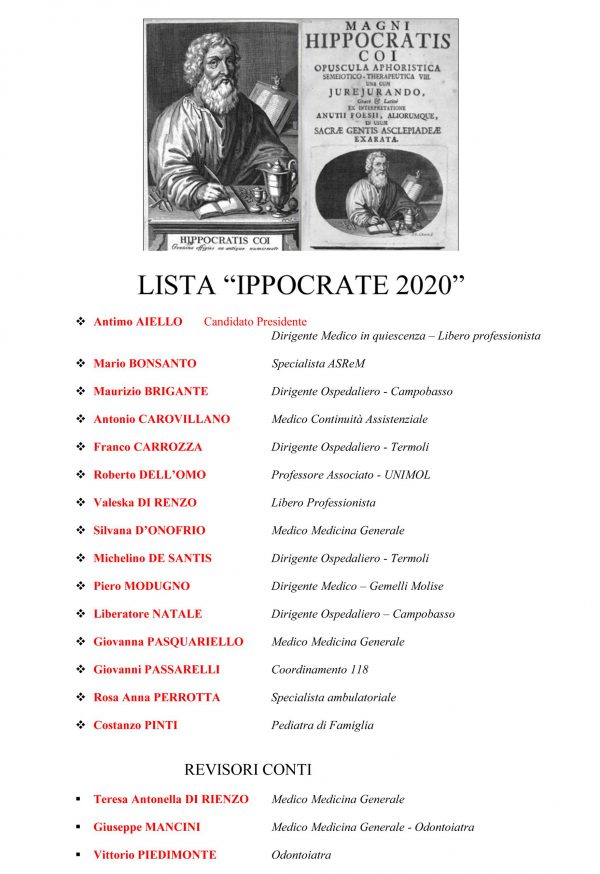 Questi i nomi dei candidati consiglieri in corsa con la lista “Ippocrate 2020”: Mario Bonsanto, specialista Asrem, Maurizio Brigante, dirigente ospedaliero (Campobasso), Antonio Carovillano, medico di continuità assistenziale, Franco Carrozza, dirigente ospedaliero (Termoli), Roberto Dell’Omo, professore associato dell’Unimol, Valeska Di Renzo, libero professionista, Silvana D’Onofrio, medico di Medicina generale, Michelino De Santis, dirigente ospedaliero (Termoli), Piero Modugno, dirigente medico del Gemelli Molise, Liberatore Natale, dirigente ospedaliero (Campobasso), Giovanna Pasquariello, medico di Medicina generale, Giovanni Passarelli, nel coordinamento del 118, Rosa Anna Perrotta, specialista ambulatoriale e Costanzo Pinti, pediatra di famiglia.