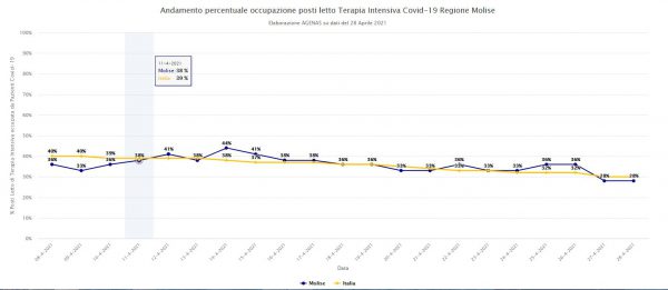 L’andamento è monitorabile sul sito di Agenas. Alla data del 27 aprile, la percentuale del 28%, così anche per il 28 aprile. I letti disponibili, fra pubblico e privato, sono 39. In base al bollettino di ieri quelli occupati sono 9.