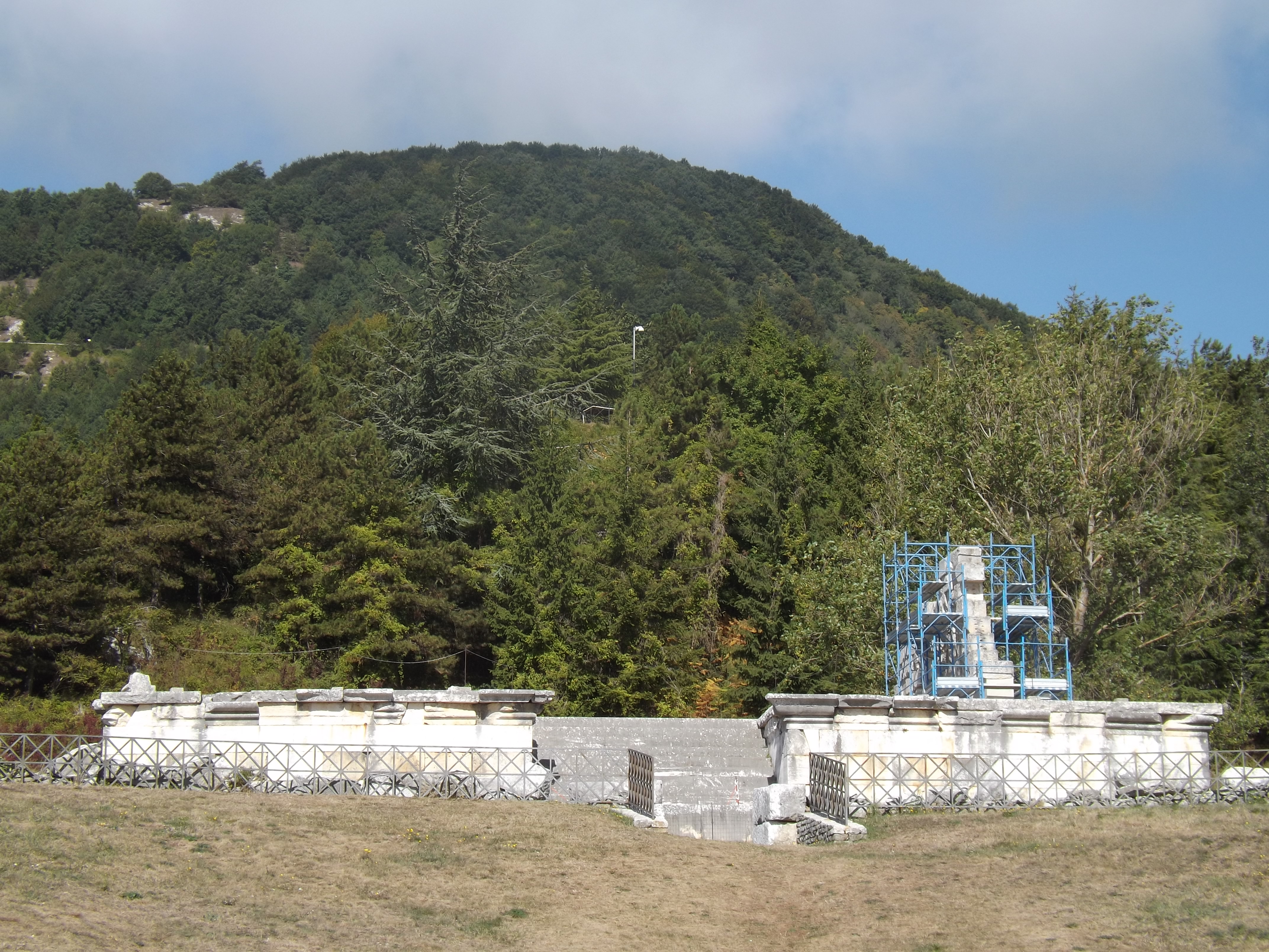 È stata trovata sotto terra in modo scomposto e grazie a studi e misurazioni è tornata ad elevarsi elegante. Nella parte interna poi c’è il sacello e gli ambienti chiusi utilizzati per omaggiare le divinità con doni votivi pregiati. Si può osservare qui la base con dedica alla dea dell’abbondanza Ops Consiva, è a lei che il sacello è dedicato. “Sapete perché questa si chiama località Calcatello? – Ci dice ad un certo punto Benito Di Marco, che si occupa del restauro – perché qui c’erano tante pietre di calcare, e quando il santuario fu dismesso, furono saccheggiate. Ora tutto deve tornare a far parte di questo monumento. Ogni singolo blocco è stato numerato e poi sono stati adattati alle basi e ricomposti”.