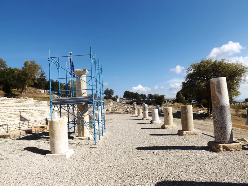 Nove colonne si innalzano delineando il lato esterno del grandioso portico a due navate, la cui parte interna ne svela altre cinque. Tutte perfettamente allineate, dopo studi e ricerche. “Quest’anno è stato fatto un grande lavoro nella zona del portico – ci spiega La Regina – siamo riusciti a ricostruirlo attraverso le colonne originali che abbiamo trovato qui e quelle che abbiamo rinvenuto in varie zone del paese, per esempio in piazza e in chiesa”. Parti delle colonne, quando il santuario fu dismesso, furono portate via dagli abitanti della zona, che le utilizzarono per costruire altre strutture. Adesso sono state tutte recuperate e sono tornate nel luogo in cui sono nate e in cui tutto il contesto esprime il loro valore. Tra queste, una è stata ricostruita interamente.