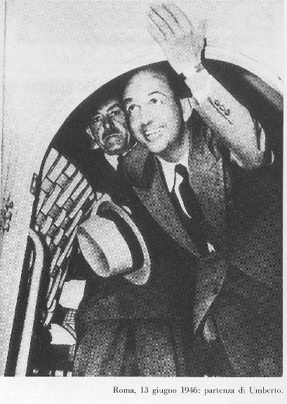 Il 13 giugno, dopo 34 giorni di regno, Umberto, senza mai abdicare, l’ascia l’Italia e viene proclamata la Repubblica Italiana. Dall’aeroporto di Ciampino, alle ore 16.07 parte per l’esilio in Portogallo. Sosta a Barcellona per la notte. Alle 22,30 l’Ansa trasmette il suo proclama di addio agli Italiani. Scende all’aeroporto di Lisbona il 14 giugno alle ore 12,20 accompagnato anche dalla duchessa Sorrentino. Con un’auto americana messagli a disposizione dal governo portoghese parte