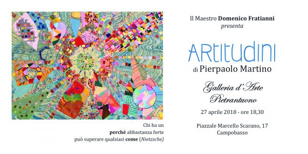 Domani, alle ore 18:30, nella galleria d’arte Pietrantuono (piazzale Marcello Scarano 17) a Campobasso, il maestro Domenico Fratianni presenterà la mostra dal titolo “Artitudini” di Pierpaolo Martino.