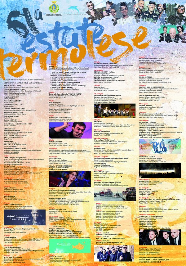 Quella del 2018 sarà l’estate dei concerti: si inizia il 23 giugno con la star di X Factor Samuel Storm in piazza Vittorio Veneto che si esibirà all’interno della kermesse di eventi organizzati dallo Spraar, il 30 giugno la band tributo a Biagio Antonacci in via Biferno tra gli eventi per la Festa della Parrocchia San Pietro e Paolo, il 2 luglio in piazza Duomo l’orchestra Punto di Valore (Progetto Spraar), il 19 luglio Morcheeba (Cous Cous Festival), 20 luglio Carl Brave X Franco 126 (Cous Cous Festival), 21 luglio Nek, Francesco Renga, Max Pezzali (Cous Cous Festival), 22 luglio Negrita (Cous Cous Festival), 31 luglio concerto di musica sinfonica ‘Nessun dorma’ (a cura della sezione Avis di Termoli ), 1 agosto Mirko Casadei (Festa Santa Maria degli Angeli), 2 agosto Massimo di Cataldo (Festa santa Maria degli Angeli), 3 agosto Concerto lirico sinfonico ‘Città di San Severo’ (Festa di San Basso), 3 agosto Makeda (Food Truck Festival), 4 agosto Apres la classe – Circomanicomio (Food Truck Festival), 4 agosto Concerto sinfonico ‘Città di Noicattaro’ (Festa di San Basso), 5 agosto Roy Paci & Aretuska ‘Valelapena Tour’ (Festa di San Basso), 8 agosto Concerto d’Estate Corale di Termoli, 10 agosto Musica di strada, 11 agosto Acid Lake (a cura della sezione Avis di Termoli), 14 agosto Kerri Chandler, Mekkani SS, Mark Di Meo (Musurplage), 16 agosto Galeffi, DjGruff, Mox (Musurplage), 17 agosto Real Rockers (Musurplage), 18 agosto Frah Quintale (Musurplage), 29 agosto Tortured Soul (Termoli Jazz Festival), 30 agosto Walter Ricci (Termoli Jazz Festival), 31 agosto The Snips (Termoli Jazz Festival), 1 settembre Max Ionata (Termoli Jazz Festival), 2 settembre Daniele Sorrentino e Nichi Nicolai.