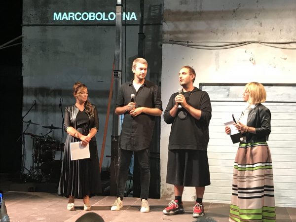Dopo i vari interventi, è toccato a loro, i veri protagonisti della serata: Marco Giugliano e Nicolò Bologna. Capelli biondi, look total black e sneakers ai piedi (rispettivamente Balenciaga ‘Triple S’ e Adidas superstar). Visibilmente emozionati, hanno parlato di quanto sia stato interessante per loro «lavorare sul discorso del miele. La forza e la tenerezza della sostanza, rappresenta a pieno la donna Marcobologna, una vera e propria ape regina».