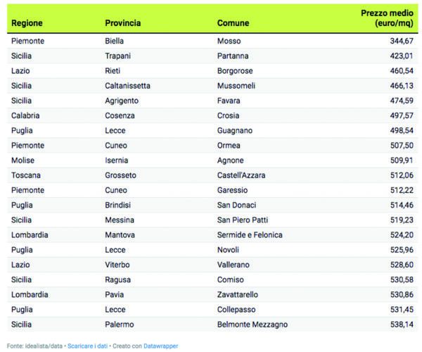 Tra i Comuni più economici in assoluto spiccano Mosso (344,67 euro/mq) in provincia di Biella, Partanna (423,01 euro/mq) in provincia di Trapani, e Borgorose (460,54 euro/mq) in provincia di Rieti, rappresentando Nord, Sud e Centro dello Stivale.