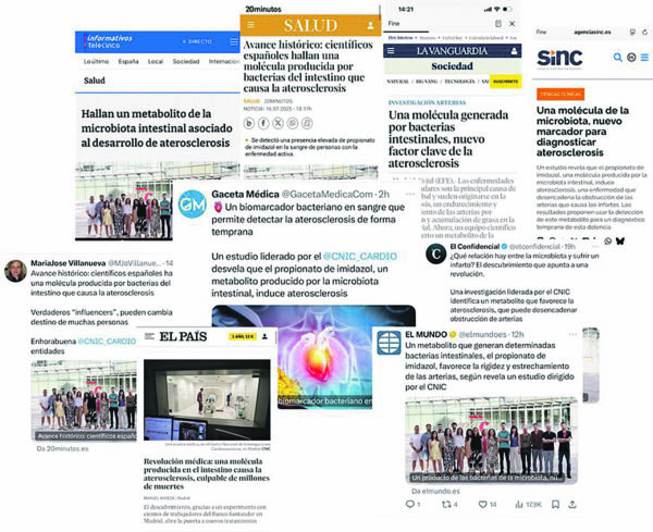 nell’aterosclerosi, un indurimento e restringimento delle arterie dovuto a infiammazione e accumulo di grasso nelle pareti arteriose. Sebbene vengano controllati fattori come il colesterolo, l’ipertensione o il fumo, è fondamentale la diagnosi precoce della malattia. I nuovi risultati, guidati dal CNIC e pubblicati sulla rivista Nature, hanno identificato che un metabolita prodotto da batteri intestinali, il propionato di imidazolo (ImP), è rilevabile nel sangue già nelle fasi iniziali dell’aterosclerosi attiva. Questo metabolita, «è prodotto esclusivamente da batteri intestinali», spiega Annalaura Mastrangelo, ricercatrice del CNIC e prima autrice dello studio. «In questa ricerca abbiamo osservato che la sua presenza nel sangue è associata allo sviluppo di aterosclerosi attiva in soggetti apparentemente sani». Ciò che rende importante questa scoperta, sottolinea la dottoressa Mastrangelo, è che «rilevare questo marcatore nel sangue rappresenta un grande vantaggio, dato che le attuali tecniche diagnostiche richiedono esami di imaging avanzati, complessi e costosi, non coperti dal sistema sanitario. I livelli di ImP nel sangue offrono un marcatore diagnostico utile per identificare persone sane con aterosclerosi attiva e permettere un trattamento precoce». Ma la scoperta va oltre. Iñaki Robles-Vera, anch’egli primo autore dello studio, aggiunge: «Non solo abbiamo osservato che i livelli di ImP sono elevati nelle persone con aterosclerosi, ma che è un agente causale della malattia. La somministrazione di ImP ha provocato la formazione di placche nelle arterie in modelli animali di aterosclerosi. L’ImP attiva il recettore imidazolinico di tipo 1 (I1R), generando un aumento dell’infiammazione sistemica che contribuisce allo sviluppo dell’aterosclerosi». Per David Sancho, responsabile del Laboratorio di Immunobiologia e leader dello studio, «questa scoperta è importante perché apre una nuova via terapeutica». Nello studio pubblicato su Nature, aggiunge, è stato dimostrato che l’uso di bloccanti del recettore I1R previene l’induzione dell’aterosclerosi da parte di ImP e riduce la progressione della malattia in modelli murini alimentati con una dieta ricca di colesterolo. “Questo apre la prospettiva futura di un trattamento combinato: blocco di I1R insieme al blocco della produzione di colesterolo, con l’obiettivo di ottenere un effetto sinergico che prevenga lo sviluppo dell’aterosclerosi”, afferma il dottor Sancho. Questi risultati, aggiunge, «aprono nuove possibilità per una diagnosi precoce e un trattamento personalizzato dell’aterosclerosi. In futuro, anziché focalizzarsi solo sul colesterolo e altri fattori classici, si potrebbe analizzare la presenza di ImP nel sangue come segnale di rischio. Al CNIC stiamo già lavorando allo sviluppo di farmaci che blocchino gli effetti dannosi dell’ImP».