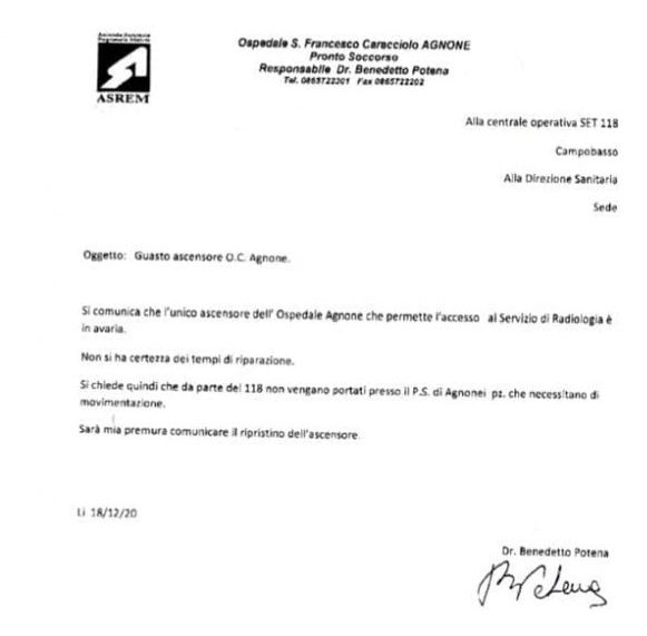 «Fino a quando ce la faccio Manuel andrà ovunque e dappertutto, ma non è possibile una cosa del genere. – riprende Nicola Di Filippo – Posso capire un guasto meccanico, ma dopo una settimana non è più accettabile. Oltre a noi c’erano in attesa anche altri pazienti, due donne anziane che avevano necessità di raggiungere quel famoso quarto piano e che credo abbiano rinunciato e siano andate via. Non c’è un cartello, né un avviso, nulla di nulla. Ti fanno uscire di casa, in questo periodo di emergenza sanitaria, con tutti i rischi del caso, poi arrivi lì sul posto e non puoi accedere al quarto piano perché l’ascensore non funziona. Gli operatori mi hanno assicurato di aver segnalato il guasto da diversi giorni, si parla di oltre una settimana. Ho protestato, ma questo è…» chiude, quasi rassegnato, papà Nicola. Il guasto pare risalga al 16 dicembre. L’intervento di manutenzione era previsto per l’indomani, quindi il 17, ma fino a ieri nessun tecnico è stato avvistato presso i corridoi dell’ospedale di frontiera dell’Alto Molise. Nei giorni scorsi un paziente è stato trasportato su una barella spinale a forza di braccia fino al quarto piano, con tutti gli intuibili rischi che la inconsueta procedura ha comportato. E indagando, come facciamo sempre noi giornalisti, spunta un documento interno sul quale testualmente si legge: «Si comunica che l’unico ascensore dell’ospedale di Agnone che permette l’accesso al servizio di Radiologia è in avaria. Non si ha certezza dei tempi di riparazione. Si chiede quindi che da parte del 118 non vengano portati presso il Pronto soccorso di Agnone i pazienti che necessitano di movimentazione».