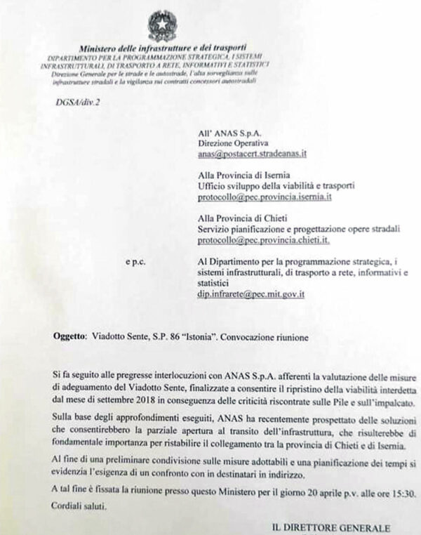 «Sulla base degli approfondimenti eseguiti, Anas ha recentemente prospettato delle soluzioni che consentirebbero la parziale riapertura al transito dell’infrastruttura che risulterebbe di fondamentale importanza per ristabilire il collegamento tra la provincia di Chieti e di Isernia». Nero su bianco, su carta intestata del ministero delle Infrastrutture e Trasporti, firmato da tale Felice Morisco, qualifica direttore generale del Mit appunto. Vengono spazzate via, a colpi di documenti ufficiali, ampiamente anticipati su queste colonne, le gratuite affermazioni di un consigliere provinciale in carica, l’ingegner Franco Marcovecchio, che nei giorni scorsi, a commento delle notizie puntualmente pubblicate dalla nostra testata giornalistica, aveva bollato le stesse quali «fantasie di personaggi non addetti ai lavori». Prima l’annuncio di Luciano D’Alfonso, già senatore della Repubblica, oggi deputato, prima ancora governatore dell’Abruzzo, nonché funzionario Anas in aspettativa, che aveva dichiarato in esclusiva alla nostra redazione: «Per il viadotto Sente siamo vicini alla soluzione». E ancora: «La prossima settimana – esattamente questa in corso – partirà la nota tecnica da parte di Anas che accompagna il progetto appaltabile di rigenerazione funzionale dell’intera struttura di supporto del viadotto Sente, per dieci milioni di euro». Subito dopo il geologo ed ex vice sindaco di Agnone, Domenico Di Pasquo lo aveva confermato, sempre su queste colonne: «Anas è pronta a riaprire il viadotto Sente – Longo». Dichiarazioni e notizie, ovviamente verificate dalla nostra redazione prima di essere pubblicate, derubricate a «fantasie di personaggi non addetti ai lavori» dall’ingegnere Marcovecchio, che evidentemente, a dispetto dei titoli accademici e degli incarichi politici, risulta piuttosto distratto sul tema viadotto Sente. E come ampiamente previsto e anticipato, arriva ieri, direttamente dal ministero delle Infrastrutture, la nota ufficiale, siglata appunto da direttore generale, che zittisce le strampalate dichiarazioni di Marcovecchio. Con la nota ministeriale indirizzata alla direzione operativa dell’Anas, alla Provincia di Isernia e all’omologo ente del Chietino, e per conoscenza al Dipartimento per la programmazione strategica, sistemi infrastrutturali del governo, il direttore Morisco convoca ufficialmente una riunione “interforze” inerente il viadotto Sente e la ex statale 86 Istonia. «Si fa seguito alle pregresse interlocuzioni con Anas spa, afferenti la valutazione delle misure di adeguamento del viadotto Sente, finalizzate a consentire il ripristino della viabilità interdetta dal mese di settembre 2018 in conseguenza delle criticità riscontrate sulle pile e sull’impalcato. – si legge testualmente sul documento del Ministero – Sulla base degli approfondimenti eseguiti, Anas ha recentemente prospettato delle soluzioni che consentirebbero la parziale riapertura al transito dell’infrastruttura che risulterebbe di fondamentale importanza per ristabilire il collegamento tra la provincia di Chieti e di Isernia». «Al fine di una preliminare condivisione sulle misure adottabili e una pianificazione dei tempi, – continua il direttore generale Felice Morisco – si evidenzia l’esigenza di un confronto con i destinatari in indirizzo». Ovvero l’Anas e le due Province di Isernia e Chieti. «A tal fine, – chiude la nota di Morisco – è fissata la riunione presso questo Ministero per il giorno 20 aprile, alle 15.30».