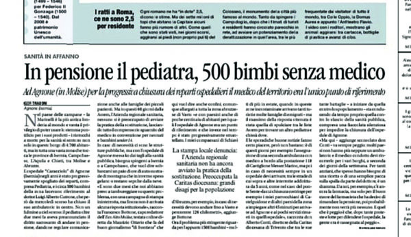 Il caso del pediatra dell’alto Molise che va in pensione e non sarà rimpiazzato, almeno nell’immediato, approda sulla stampa nazionale. Varie le testate giornalistiche e le redazioni tv e web che si sono interessate alle vicenda. Tra queste il quotidiano della Conferenza episcopale italiana, “Avvenire”, con un articolo curato da Igor Traboni, giornalista non nuovo a “incursioni” in alto Molise. Tra i passaggi salienti del pezzo l’intervento di don Alberto Conti, direttore della Caritas diocesana di Trivento, il quale sottolinea la rassegnazione di una comunità, quella non solo agnonese, ma più in generale di coloro che vivono in alto Molise e alto Vastese, che vede privarsi dei più elementari diritti, come quello alle cure mediche appunto, senza battere ciglio.