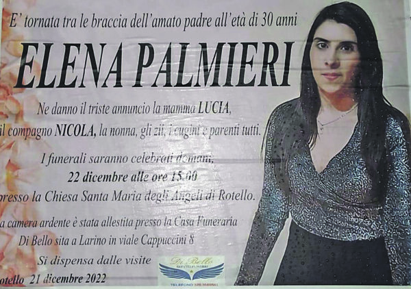 «E’ tornata tra le braccia dell’amato padre all’età di 30 anni». Questo recita l’annuncio funebre della giovane Elena Palmieri, dato dalla mamma Lucia e dal compagno Nicola. Un lutto che ha colpito nel profondo la comunità di Rotello. Ieri pomeriggio i funerali della ragazza, nella chiesa di Santa Maria degli Angeli, celebrata da don