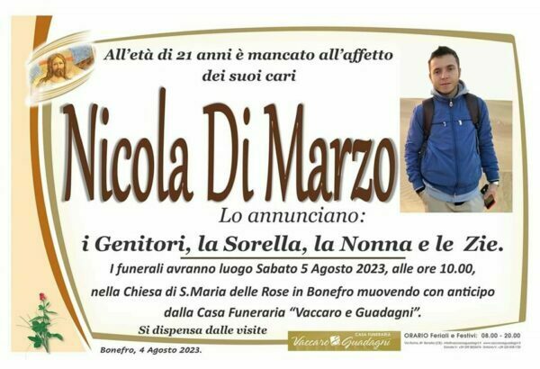 strappato agli affetti il 21enne Nicola Di Marzo, gettando nello sconforto la sua famiglia e nello sgomento la comunità di Bonefro, che oggi vivrà nel clima di lutto cittadino l’ultimo saluto al giovane. A darne notizia il sindaco, Nicola Giovanni Montagano, che ha proclamato il lutto cittadino per oggi, 5 agosto, in concomitanza con la celebrazione dei funerali del 21enne in segno di cordoglio per la sua tragica scomparsa, unendosi in tal modo al dolore di familiari, amici e della comunità tutta. «I pubblici esercizi, gli esercizi commerciali ed artigianali, le istituzioni pubbliche, le organizzazioni sociali, culturali e produttive, i titolari di ogni genere di attività e la cittadinanza nella sua interezza sono invitati a manifestare il proprio cordoglio mediante la sospensione delle attività, e comunque rispettando il silenzio, nella fascia oraria compresa tra le ore 9 e le ore 12 del 5 agosto 2023. Le manifestazioni pubbliche in programma sono state rinviate175, ha reso noto sul profilo social istituzionale, per poi offrire un ricordo personale su quello privato. «Caro Nicola, la tua vita è stata segnata da una grave malattia che sin dalla tenera età ti ha portato a fare dentro e fuori dagli ospedali, a sottoporti a sfiancanti terapie e lunghi viaggi della speranza. Tuttavia, sei sempre stato partecipe della vita della nostra comunità, così come seguivi da vicino le vicende dell’azienda agricola di famiglia, eri costantemente in contatto con i tuoi amici a Bonefro, sempre attento a tutti i dettagli. Ti scattai questa foto in occasione di un viaggio di gemellaggio. Ora non ci resta che il silenzio, mentre ci stringiamo commossi al dolore dei tuoi familiari per la tua prematura scomparsa. Riposa in pace e proteggici da lassù, Nicola».