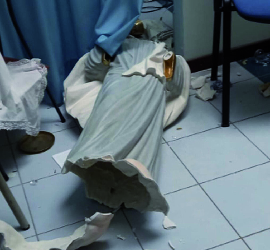 Poi, è arrivata una ricostruzione dell’accaduto, a firma di una parrocchiana (C. M.). «Il fatto è avvenuto non al pomeriggio del 17 agosto ma nella notte inoltrata tra il 16 e il 17 agosto, precisamente intorno alle 5.00 di mattina quando qualcuno ha visto un tizio camminare come uno sbandato che sicuramente tentava di rientrare a casa. Oltre alle ore 3.00 della mattina del 17 tanta gente era rimasta ancora seduta ai tavolini dei bar a consumare al suono della musica trasmessa dal bar di fronte al comune. E la chiesa/Centro della Comunità non è lontana dal Comune. Il porta lumini di ferro è stato trovato scaraventato tra le sedie e la statua sicuramente non è stata travolta nel tentativo di scappare in quanto la statua si trovava su un piedistallo di marmo alto oltre un metro sul presbiterio accanto all’altare e ci sono tre scalini che separano il presbiterio dal resto della sala. Il candelabro-porta lumini di ferro si trovava ai piedi degli scalini, quindi il ladro è salito apposta sul presbiterio per prendersela con la statua non avendo trovato soldi , poi è sceso per scappare travolgendo parecchie sedie. La statua, buttata giù, e alla quale è stata anche strappata la corona del rosario (forse pensando che fosse preziosa), ha fatto cadere da un tavolino lì accanto lezionari, calice che si è ammaccato, ampolline che si sono rotte essendo di vetro… Qualcuno, per sminuire l’accaduto o per andare controcorrente da bastian contrario, ha inventato che in chiesa la sera del 16 era entrato un cane spaventato dai botti alla fine della processione ed era rimasto chiuso dentro. Doveva essere un cane “Superman” o un cavallo o un toro per scaraventare un candelabro di ferro e buttare a terra la statua da un piedistallo alto oltre un metro. e poi doveva essere un cane molto educato perchè avendo avuto bisogno di fare i suoi bisogni, soprattutto spaventato dai botti, sarà andato al bagno e avrà anche scaricato lo sciacquone. Maschio o femmina?
