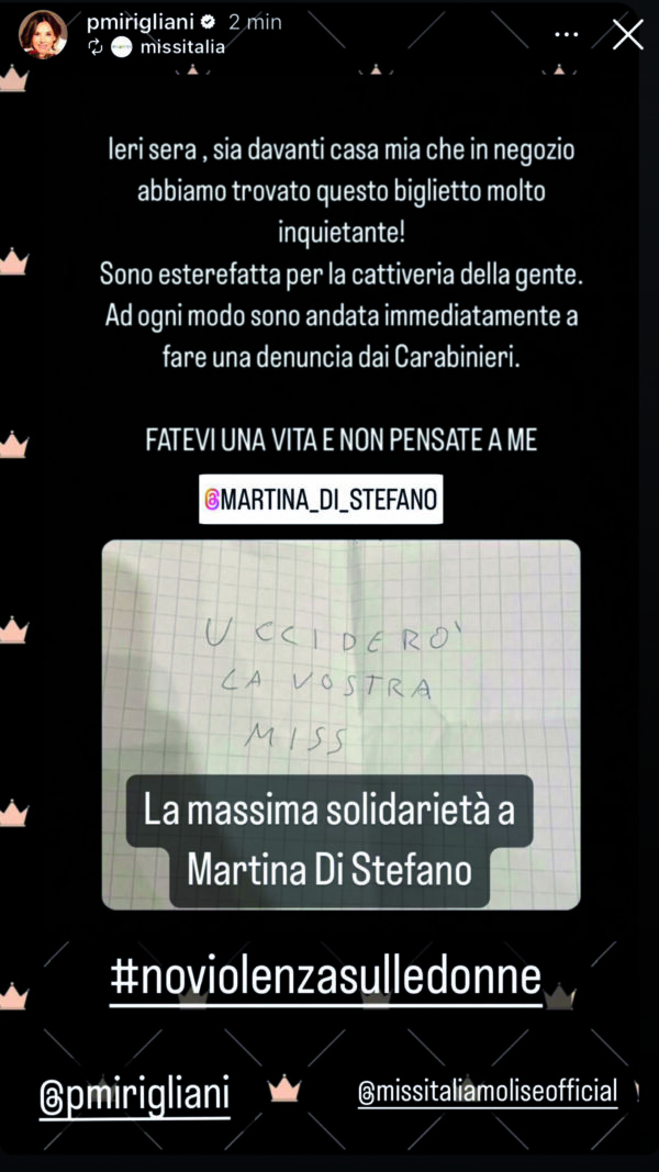 «La massima solidarietà a Martina Di Stefano», è quella espressa da Patrizia Mirigliani, detentrice del concorso Miss Italia, che ha espresso questo pensiero sui social dopo aver appreso dell’assurda vicenda che ha coinvolto Miss Molise 2023, raccontata su una storia di Instagram proprio dalla ragazza residente a Santa Croce di Magliano.