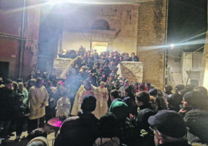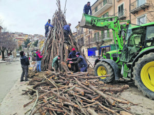 storie di ieri. Gli altissimi coni di legna ricordano l’essenza di un pensiero che va altre ogni forma di comportamento istintivo. La cultura del fuoco lo precisa. Anzi nella composizione del fuoco questo simbolo devozionale viene decisamente rimarcato. La punta di un lungo pezzo di quercia, su cui vengono appesi pezzi di carne di maiale, sistemati accuratamente sul cono per completare la sua caratteristica morfologia, è un atto d’amore verso il cielo. Per amare di più. Tutti. Nel corso della cerimonia il parroco don Luigi Mastrodomenico si sofferma sui valori cristiani. La chiesa di San Giovanni Battista è stracolma di fedeli. In tanti attendono fuori con i propri animali per ricevere la benedizione. La scena intenerisce i più piccoli. I sentimenti sono autentici. Le emozioni si amplificano al suono disteso del campanone. Il sacro tocca i capifuoco e i padroni degli animali durante la benedizione. In una cornice suggestiva, nel cuore del borgo degli angioini, tra la torre e il campanile, parte così l’accensione di tutti gli altri falo’. Ogni responsabile del fuoco preleva la brace benedetta per portarla negli altri fuochi e dare l’avvio all’accensione. Prende fuoco così la legna raccolta. I fuochi e i gruppi di lavoro, impegnati nei dettagli per far sentire il proprio calore, sono nove. Tanti. I falò sono enormi. Gli autori in maggioranza sono giovani. Tutti raccolti intorno alla brace che scintilla senza sosta.