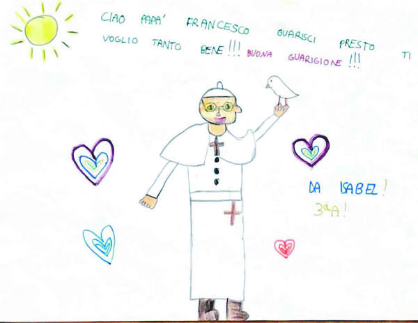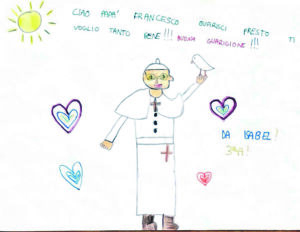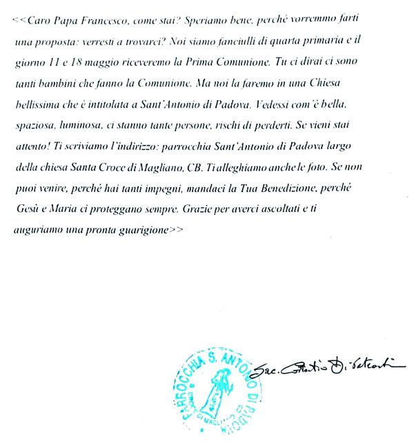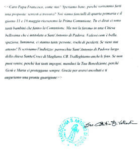 «Caro Papa Francesco, come stai? Speriamo bene, perché vorremmo farti una proposta: verresti a trovarci? Noi siamo fanciulli di quarta primaria e il giorno 11 e 18 maggio riceveremo la Prima Comunione. Tu ci dirai ci sono tanti bambini che fanno la Comunione. Ma noi la faremo in una Chiesa bellissima che è intitolata a Sant’Antonio di Padova. Vedessi com’è bella, spaziosa, luminosa, ci stanno tante persone, rischi di perderti. Se vieni stai attento! Ti scriviamo l’indirizzo: parrocchia Sant’Antonio di Padova largo della chiesa Santa Croce di Magliano. Ti alleghiamo anche le foto. Se non puoi venire, perché hai tanti impegni, mandaci la Tua Benedizione, perché Gesù e Maria ci proteggano sempre. Grazie per averci ascoltati e ti auguriamo una pronta guarigione».