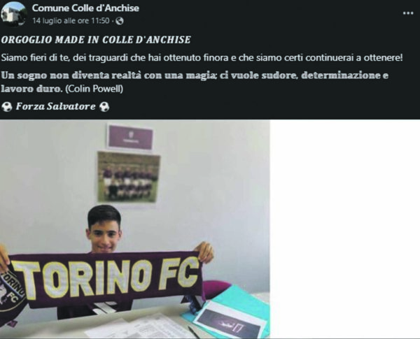 Il sogno di questo giovane calciatore molisano, che ad ottobre compirà 14 anni, si è così concretizzato: fra alcune settimane si trasferirà nel capoluogo piemontese dove oltre ad effettuare tutti i giorni gli allenamenti, tranne il lunedì, e fare palestra due volte la settimana per irrobustire il fisico, potrà continuare anche gli studi frequentando il Liceo di Scienze applicate. Nel suo percorso di crescita la società granata lo farà seguire sia da un tutor scolastico, sia da due tutor presso il convitto dove alloggerà. Ma a Torino avrà anche la vicinanza del nonno Salvo, suo primo tifoso, che ha deciso di trasferirsi nella città della Mole per non fargli mancare l’affetto e il calore dei familiari.